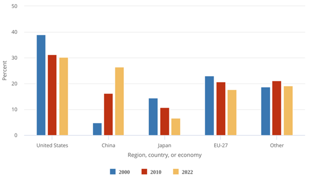 China’s rise in research spending has reshaped the global landscape. While the US share of global R&D has slipped since 2000, China’s has surged, narrowing the gap and signaling a power shift in global innovation. Source: National Science Board