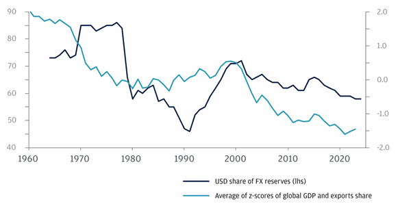 USD Share of Global FX Reserves vs. Relative US Economic Weight (GDP + Exports), 1960-2023
