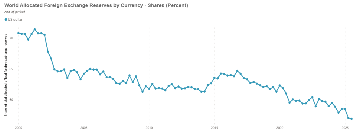 Timing matters, and Europe knows it. Over half of global foreign exchange reserves are still held in U.S. dollars. That share has been shrinking over the past decade. The euro has maintained roughly a 20% share and could edge higher if dollar confidence continues to wobble. In the past year alone, it has appreciated about 14% against the dollar.