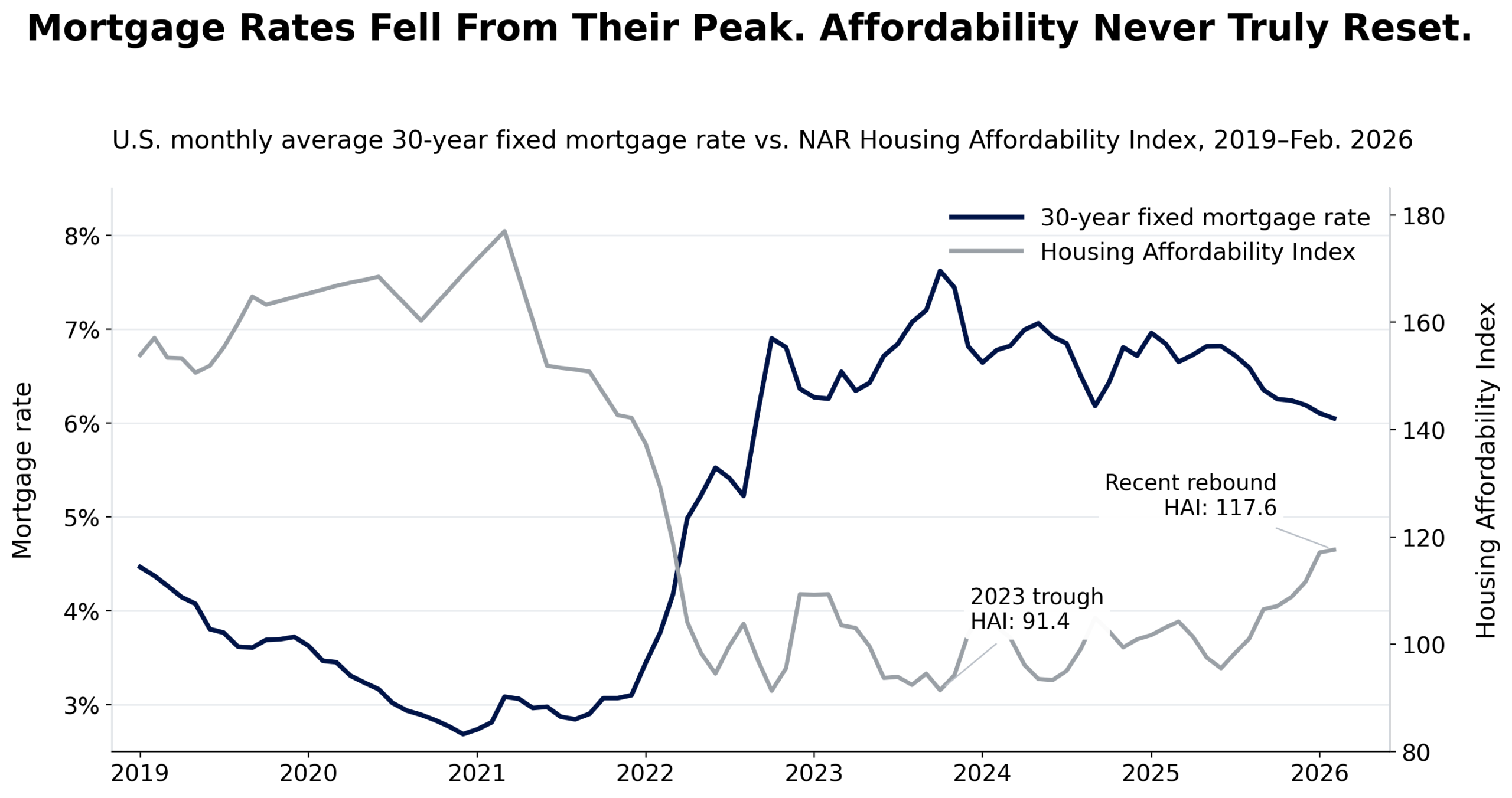 The worst of the affordability shock has passed, but the rebound has been modest relative to the scale of the mortgage-rate surge that broke buyer math in the first place. Source: Freddie Mac, 30-Year Fixed-Rate Mortgage Average; National Association of Realtors, Housing Affordability Index.