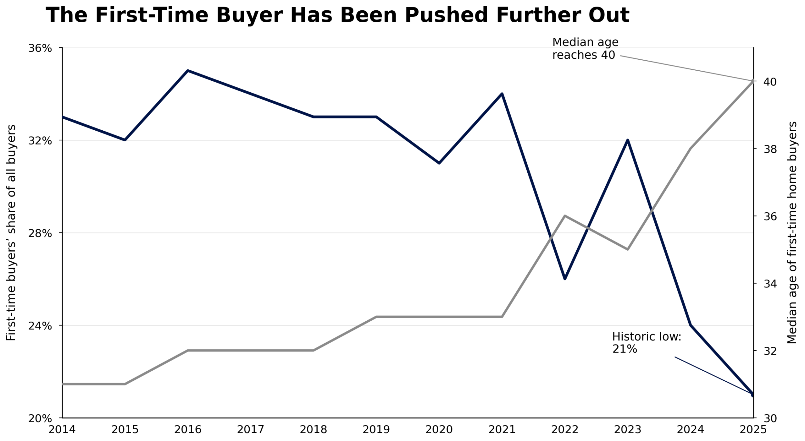 The first-time buyer has been pushed further out, with the share of first-time purchasers falling to a record low even as the median age of entry rises. Source: National Association of REALTORS®, Profile of Home Buyers and Sellers, annual reports, 2014-2025.
