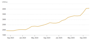 In contrast, one asset’s rise in 2025 appears almost fated. Gold has reclaimed its place as the market’s preferred refuge, and if there were ever a year for it to reaffirm that role, this has been it. By Q3, the metal had established itself once again as the closest thing to portfolio insurance investors might find. The figures speak for themselves. Prices advanced throughout the first nine months of the year, breaching historic levels at an unusual pace. Gold crossed $3,000, then $3,500, and by early October pushed past $4,000 per ounce. It began the year near $2,850 and reached almost $4,380 by late October, a gain of roughly 55% in less than ten months.