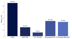 Gold’s surge and equities’ mixed performance reflect a broader shift in risk appetite during the volatile 2025 macro environment. Source: Market Data, 2025