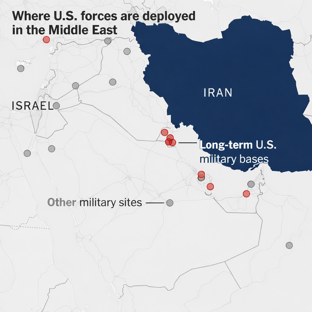 A map of U.S. air, naval, and support installations across the Middle East illustrates how a dense regional network of bases places American forces within range of multiple escalation pathways in an Iran-centered conflict. Source: NY Times